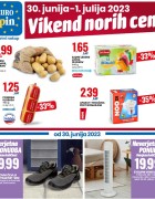 Eurospin vikend norih cen Vikend norih cen velja v petek, 30. 06. in v soboto, 01. 07. 2023 v vseh trgovinah Eurospin v Sloveniji. Ta konec tedna vas v trgovinah Eurospin čaka akcija naslednjih izdelkov: – rumeni krompir pakiran 10kg 8,99€ – sadne ledene lučke, 12 kosov, namesto 2,49€ zdaj 1,65€ – posebna klobasa 400g, […]